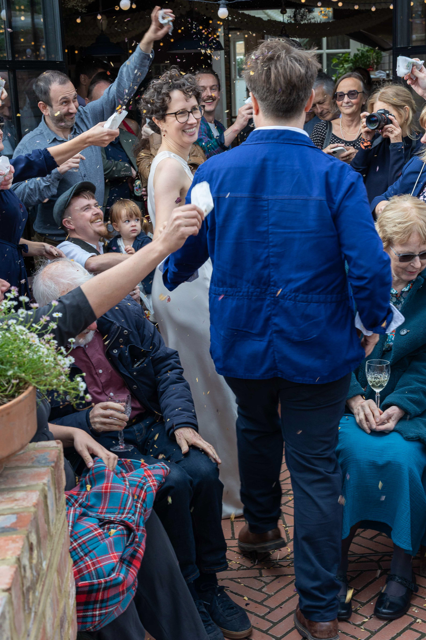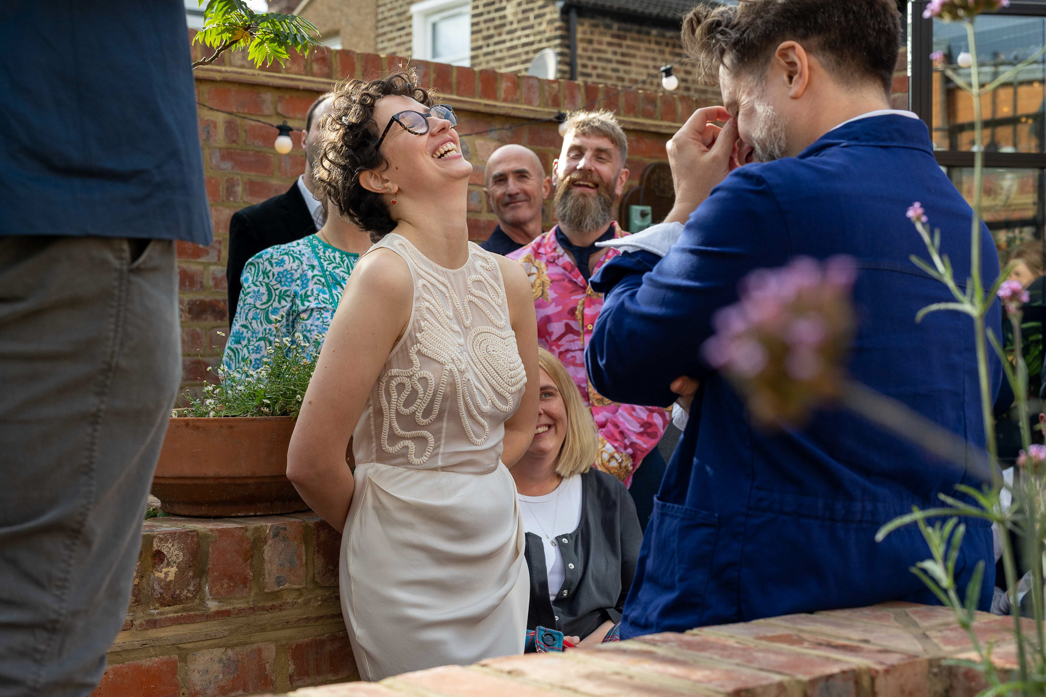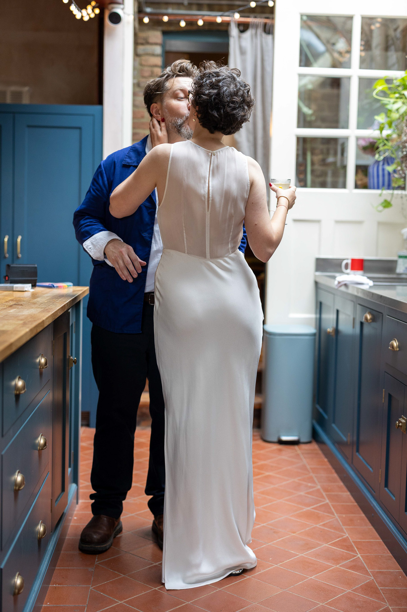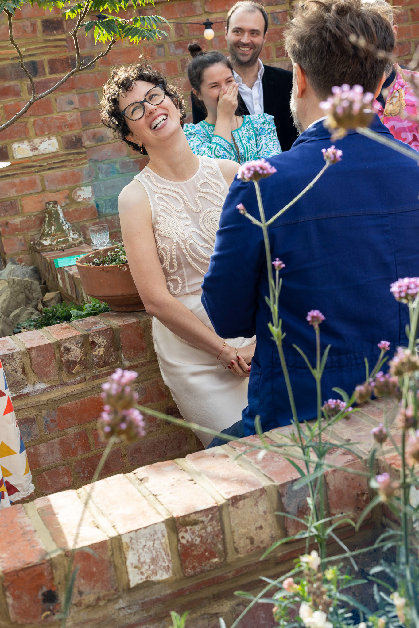 Walk around wedding photography for the intimate at wedding of Alex and Olivia in their London home and garden.